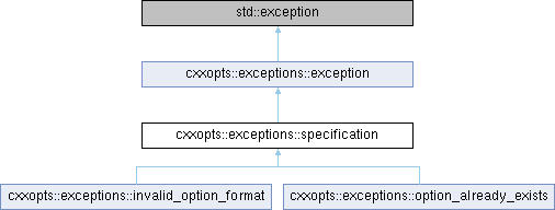 Public Member Functions inherited from cxxopts::exceptions::exception | |